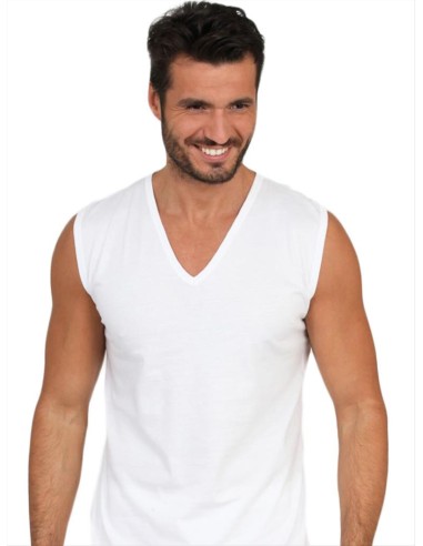 Maglia intima uomo senza maniche con scollo a V profondo, realizzata in puro cotone. Questa canotta smanicata offre comfort, traspirabilità e qualità superiori. Disponibile nelle taglie dalla 4/M alla 7/XXL nel colore Bianco. Prodotta interamente in Italia da un'azienda leader nel settore.
