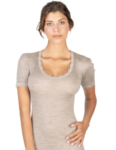 Maglia Donna a Costina in Lana Merinos e Microfibra con Manica Corta e Scollo in Pizzo - EGI 306