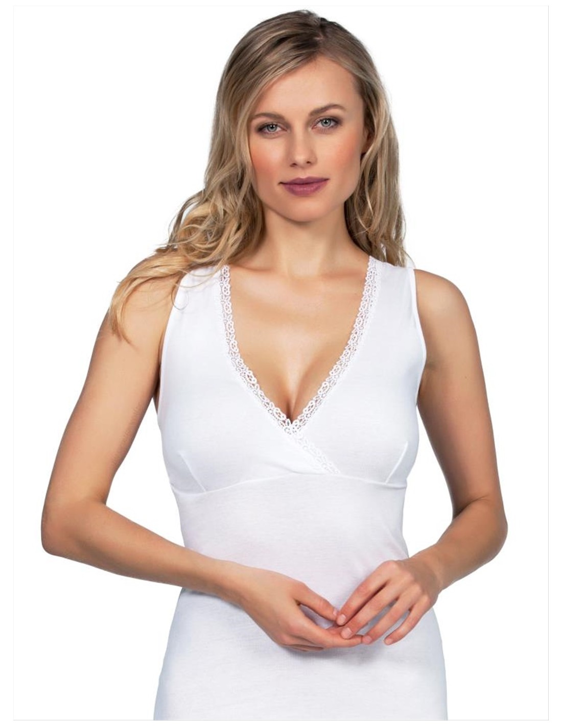 Canottiera intima donna marchio MaRe articolo 259 con spalla larga caratterizzata da uno scollo con forma del seno decorato sul bordo da un'elegante pizzetto in macramè.